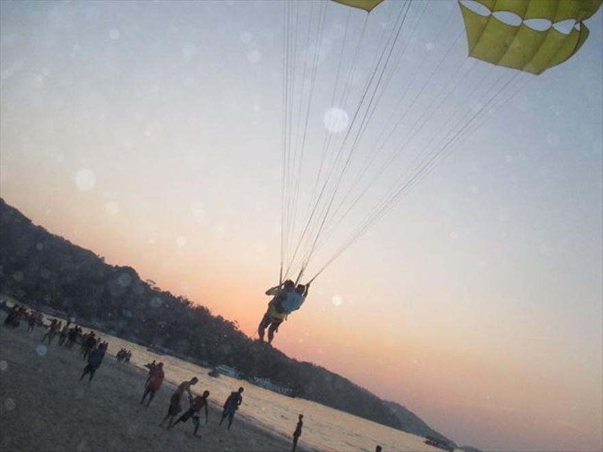 パラセーリングはこの時間が最高です。夕日に照らされてビーチが真っ赤にキラキラ光っているのを見ながら飛んでみてください。何か発見があるかもです。